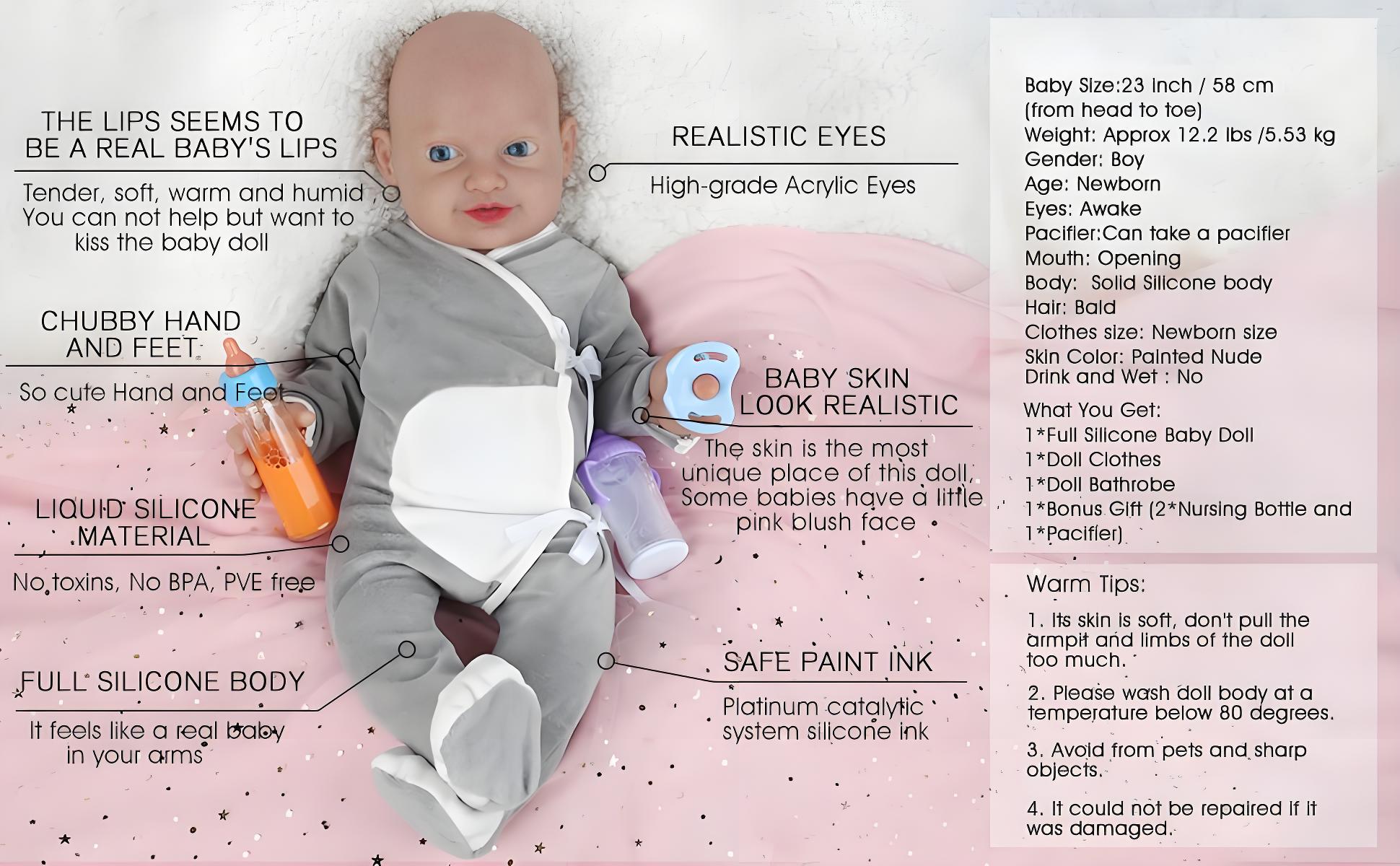 Ultra-Realistic Feel: The platinum silicone closely mimics the softness and texture of real baby skin.