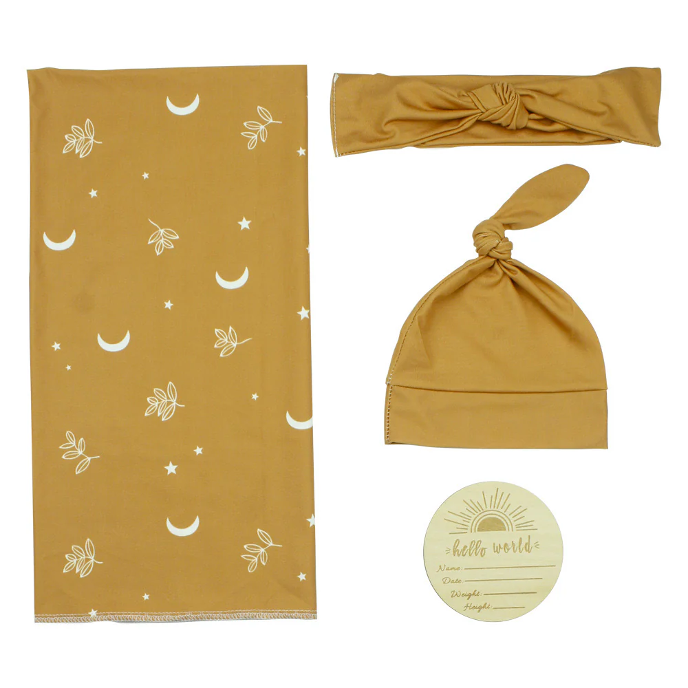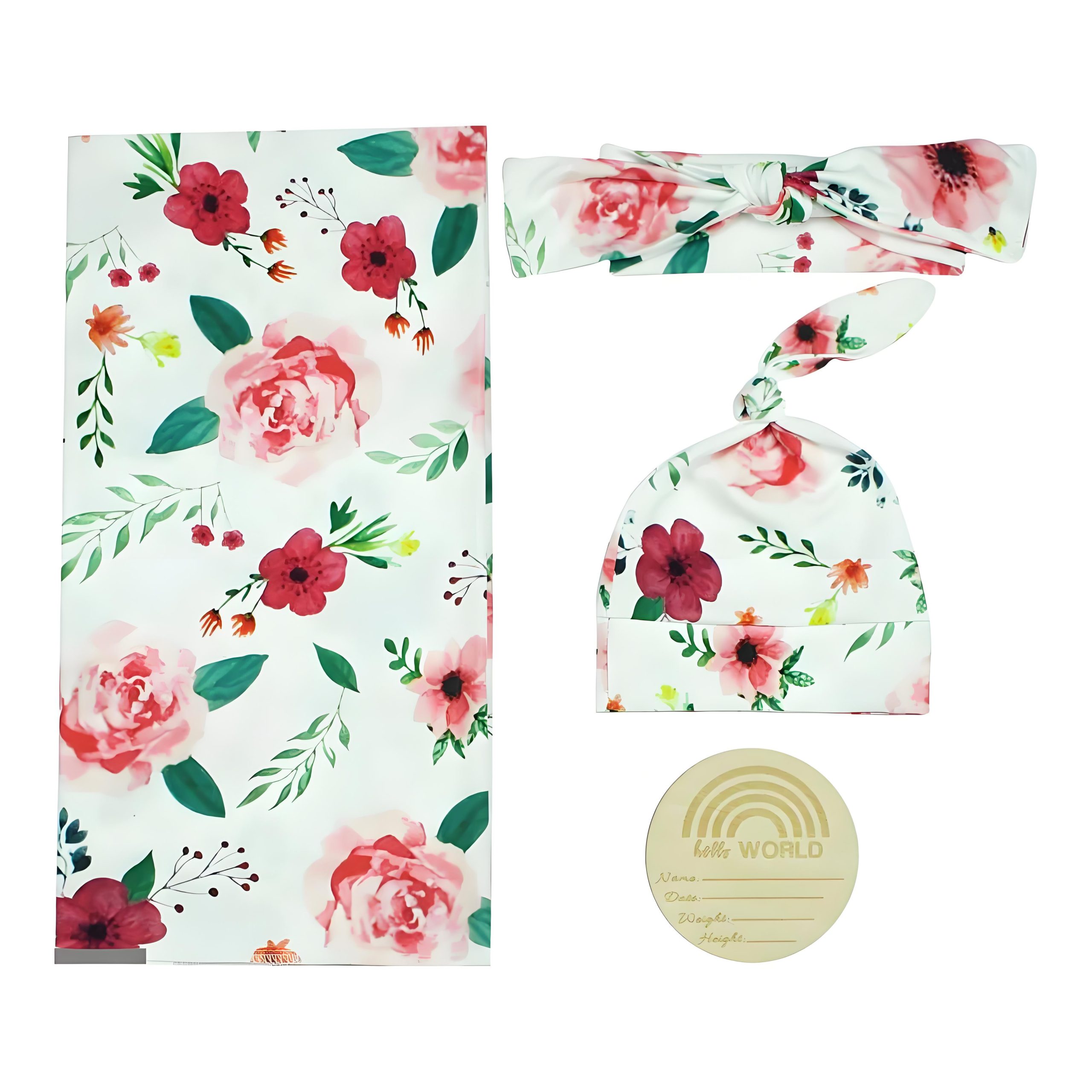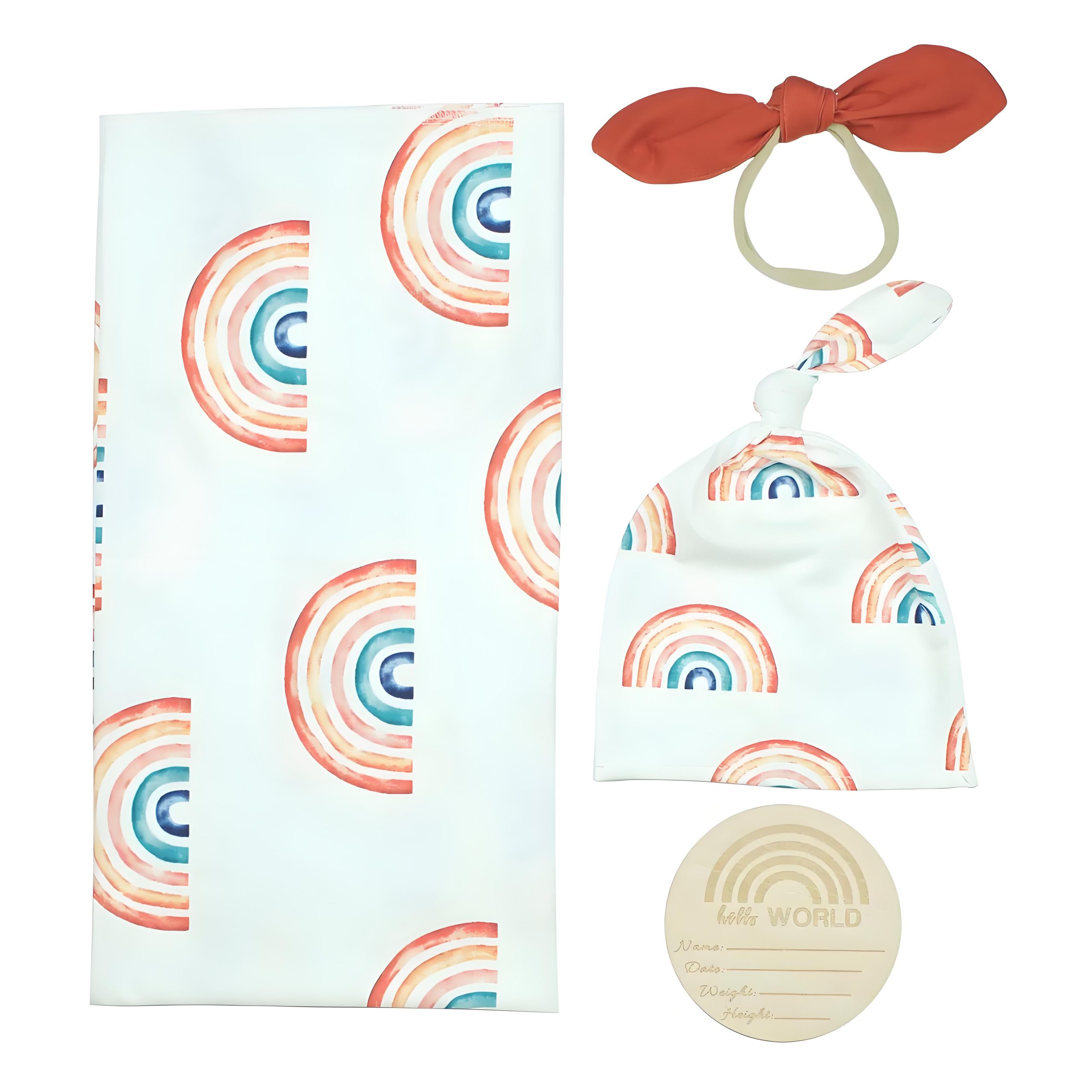 Includes wrap, bow hat (knotted or top bow), soft knit headband, and wooden milestone card for a cohesive, realistic presentation.
