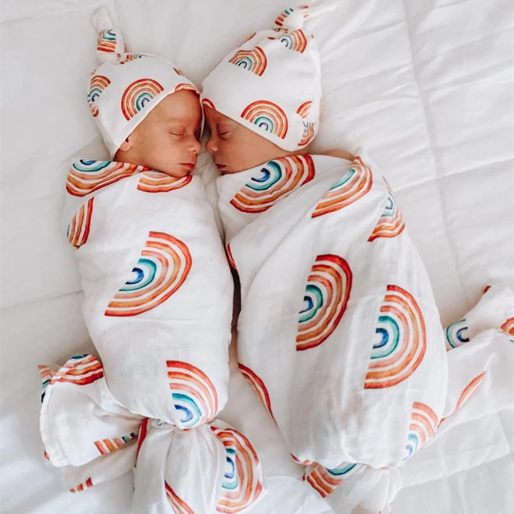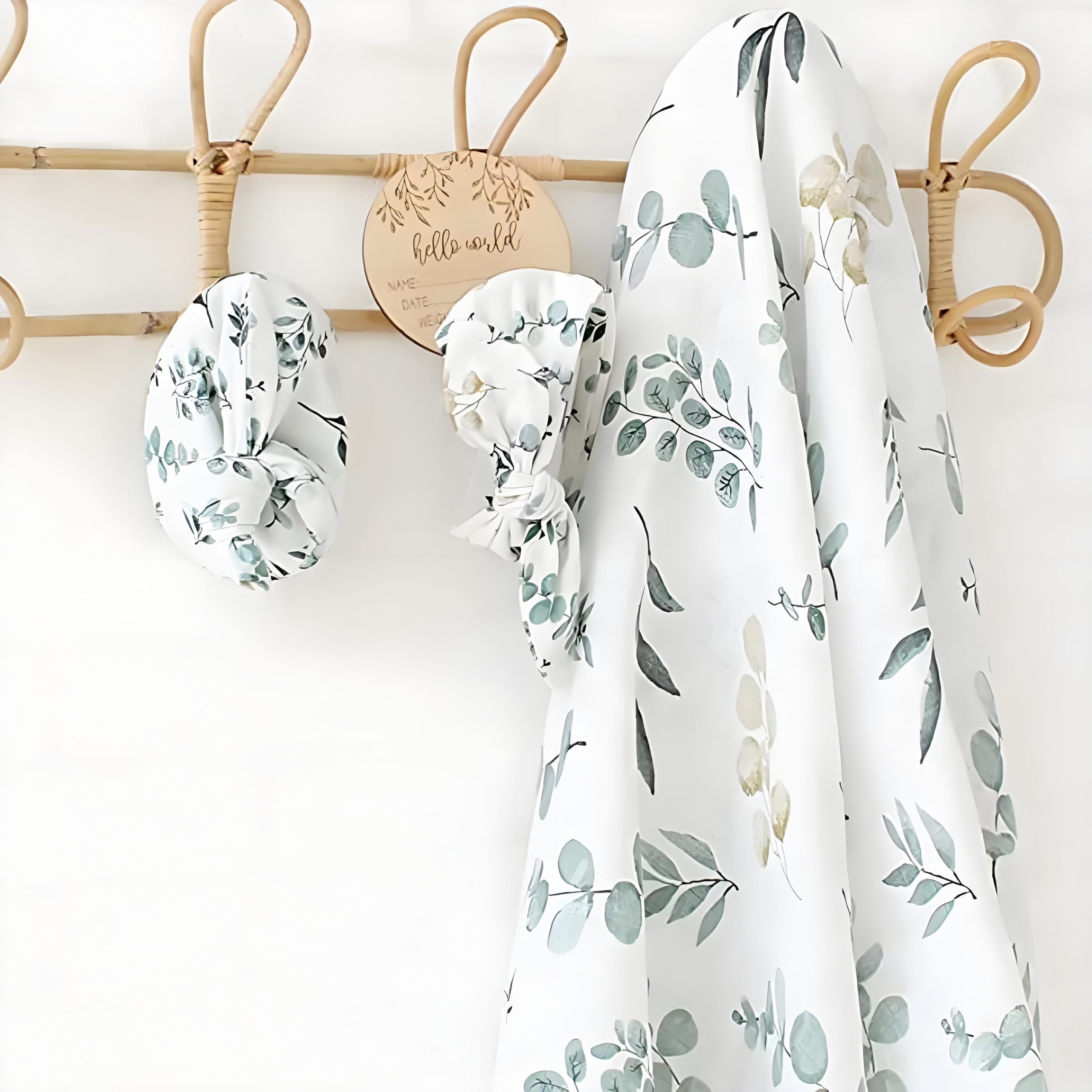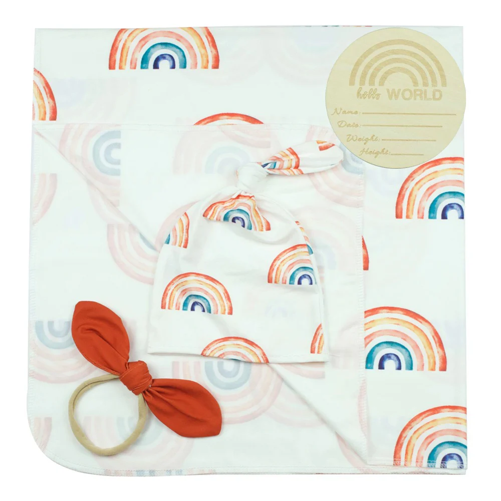 Includes wrap, bow hat (knotted or top bow), soft knit headband, and wooden milestone card for a cohesive, realistic presentation.