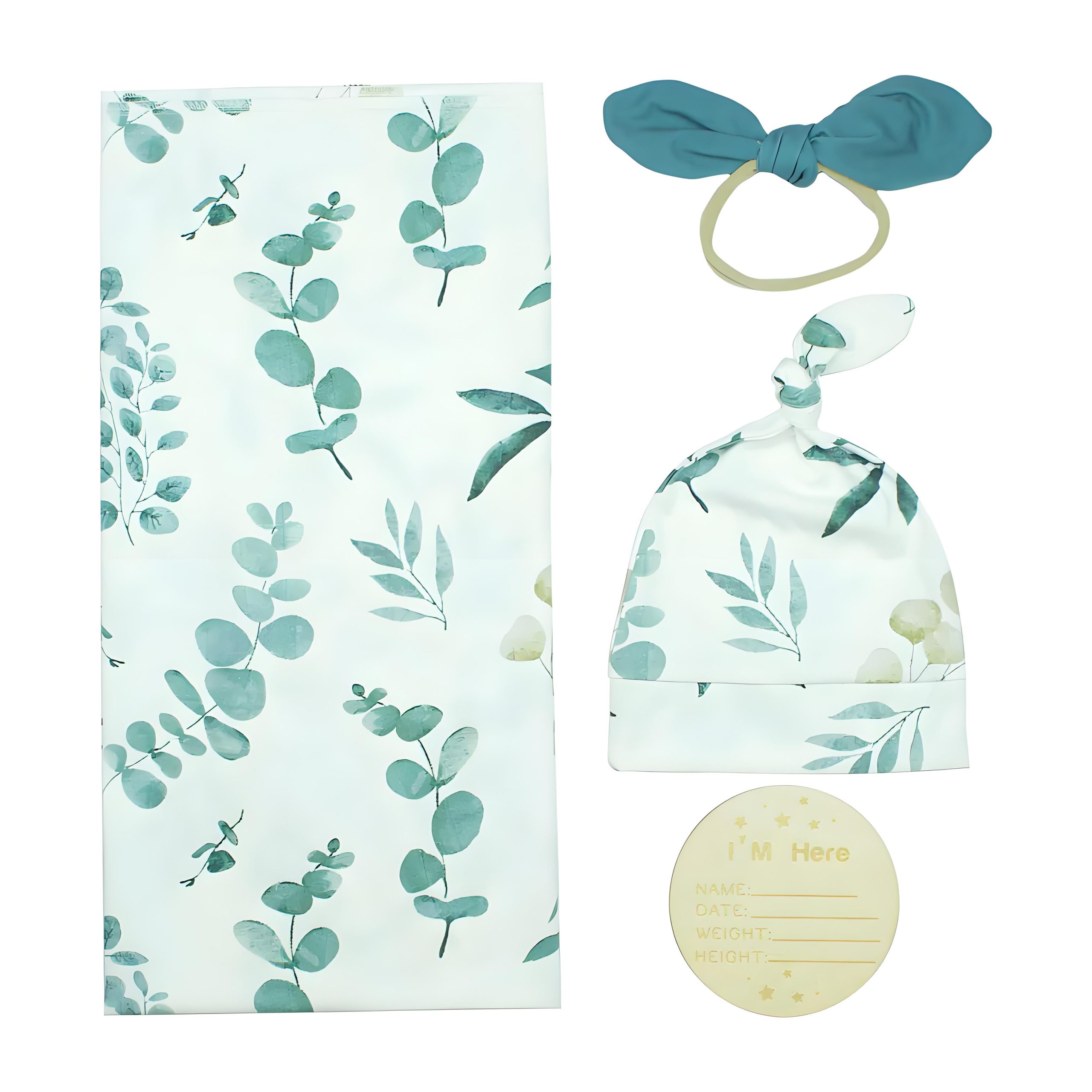 Set Includes: 1 swaddle wrap + 1 bow hat + 1 soft knit headband + 1 wooden birth announcement card (10–12 cm)
