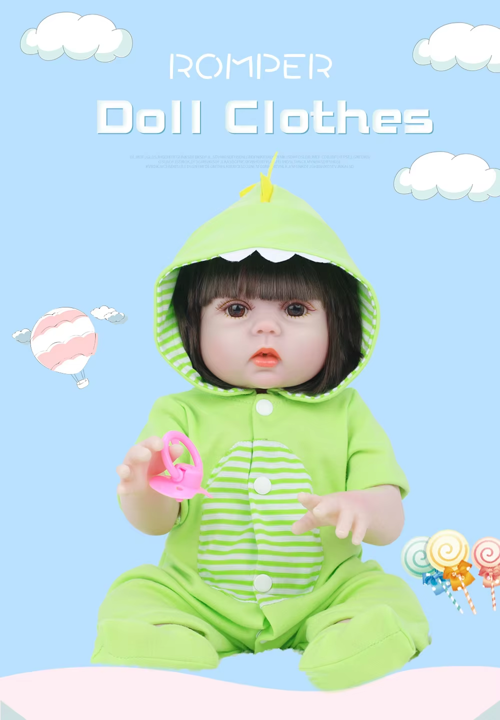 This cartoon-printed Reborn Baby Doll Clothing Set is designed for 17″–19″ newborn and reborn dolls. Made from soft, breathable, and elastic premium cotton, the romper offers a high-quality dressing experience suitable for collectors, toy brands, and children’s imaginative play. With washable durability and customizable design options, it is ideal for retail assortments and brand-exclusive collections.