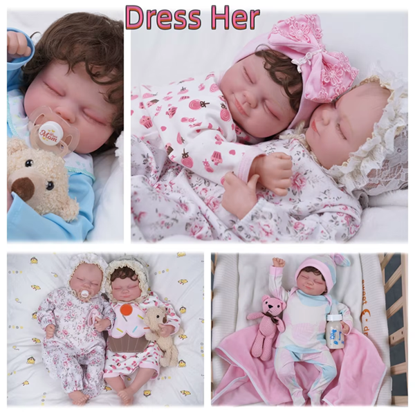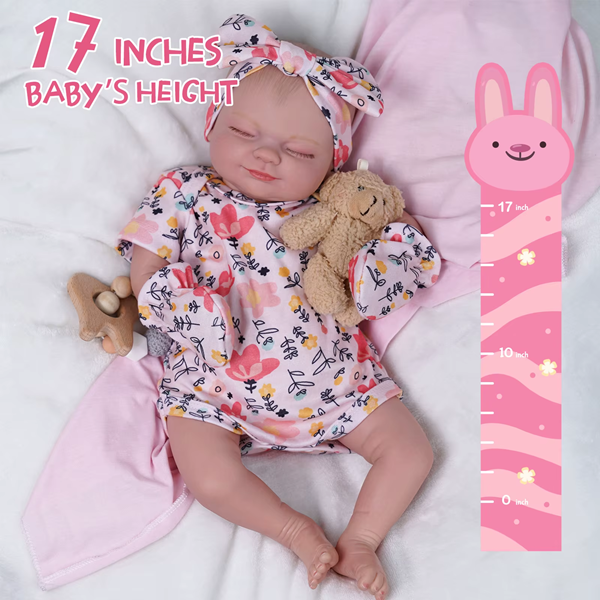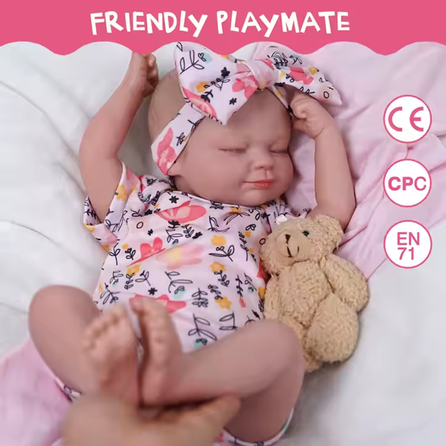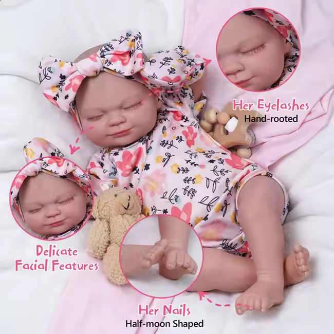 The Reborn Asleep Doll, available in 17–22 inches, is crafted with high-quality vinyl and silicone for a soft, lifelike feel and realistic sleeping expressions.